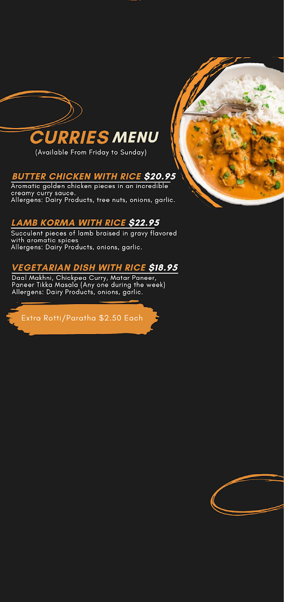 The menu highlights include standout choices like BBQ Pizza and classic curries such as Butter Chicken and Lamb Korma, served with rice. These dishes complement the warm, friendly atmosphere of the kitchen, where generous portions and straightforward flavors invite a laid-back mealtime.